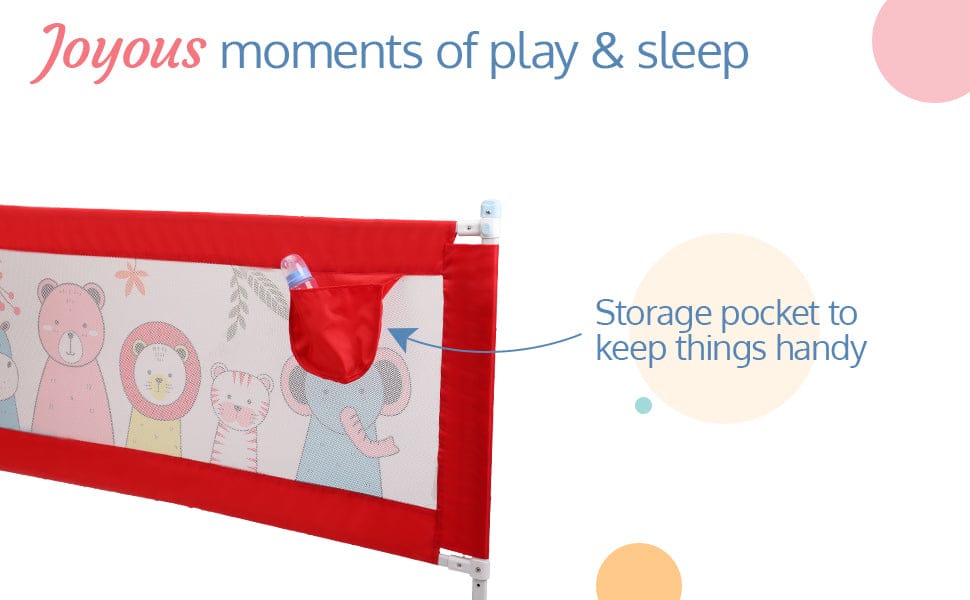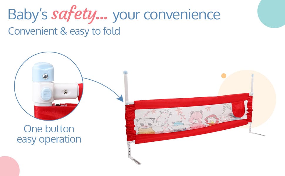 - Baby Bed Protector side rails can be folded down by pressing the safety locks on both ends to help parents to sit by the bedside easily. Comes with a storage pocket to store baby essentials.